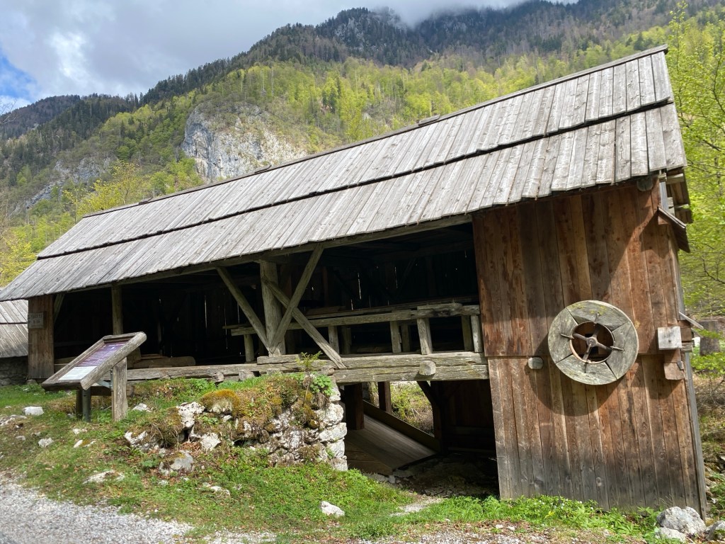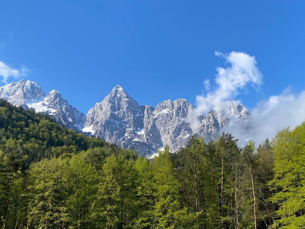 Après la pluie d’hier soir, la nuit a été calme mais froide. Trois couches de vêtements et ma cagoule n’ont pas été de trop pour maintenir une température acceptable et me permettre de passer une bonne nuit. Le soleil qui perce ce matin va sécher la toile de tente et offrir un joli spectacle sur la chaîne des Alpes Juliennes, dont les sommets autour de 2.000 mètres s’alignent face au camping. Ils sont encore bien enneigés, ce qui n’est pas étonnant au vu des températures dans la vallée.