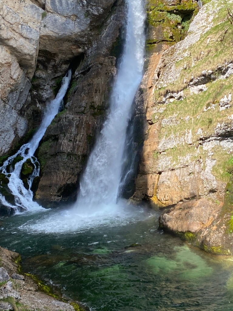Parmi les visites à effectuer autour du lac, il y a une cascade, la « slap Savica », à laquelle je tente d’abord d’accéder par le chemin piétonnier. Mais à mi-course je dois renoncer car il est vraiment impraticable avec le vélo, même tenu à la main. Je me résous donc à prendre la route, soit une petite demi-heure de grimpette à laquelle j’ajoute une autre demi-heure de montée à pied pour accéder au site de la cascade situé à environ 800 m d’altitude. L’eau jaillit de la roche et forme une double cascade, la première de 78 m et la seconde de 25. Elle l’une des sources qui alimente le lac. J’apprends au passage que celui-ci est un exemple typique de lac glaciaire. La vallée dans laquelle il se trouve a été formée par un glacier dont l’épaisseur dépassait les 1000 mètres il y a environ 20 000 ans. C’est l’érosion provoquée par sa fonte qui a donné à la vallée sa forme en U et laissé un creux qui est devenu un lac.