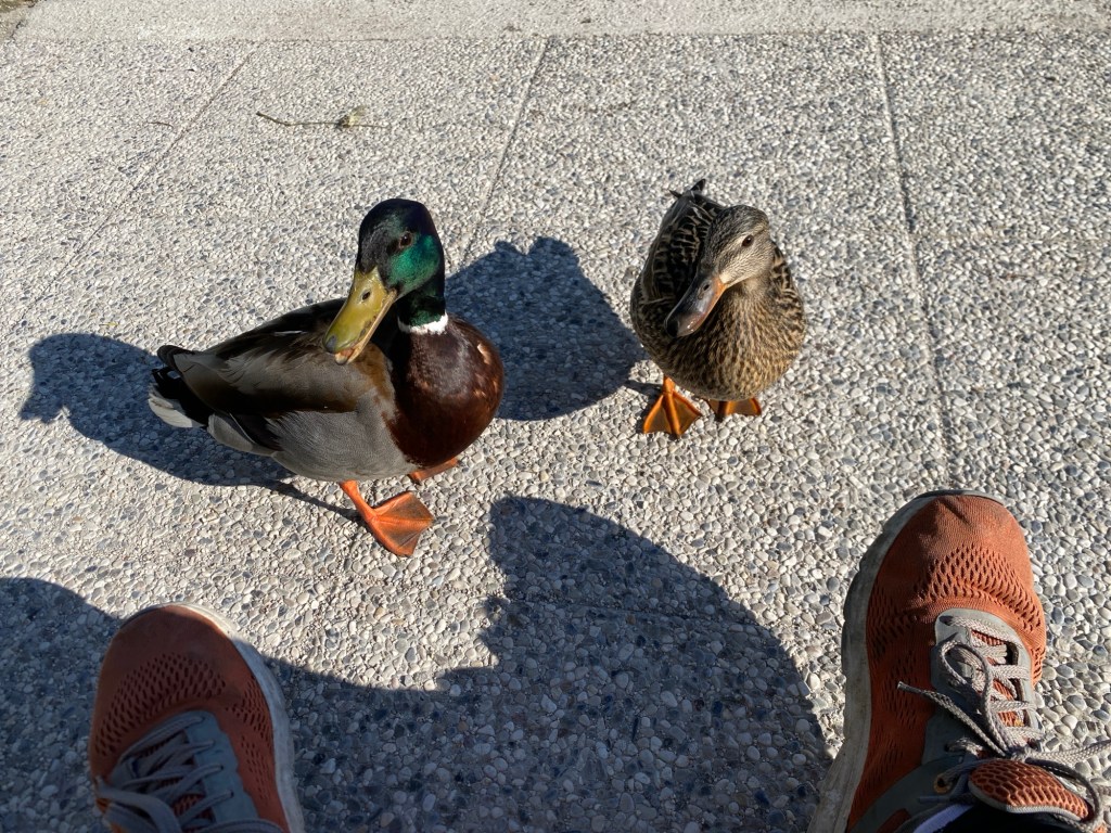 Je retrouve avec plaisir, les rives du lac de Bled, sur lesquelles je m’arrête comme hier pour casser une petite croûte, accompagné par deux canards qui aimeraient bien partager mes sandwiches.