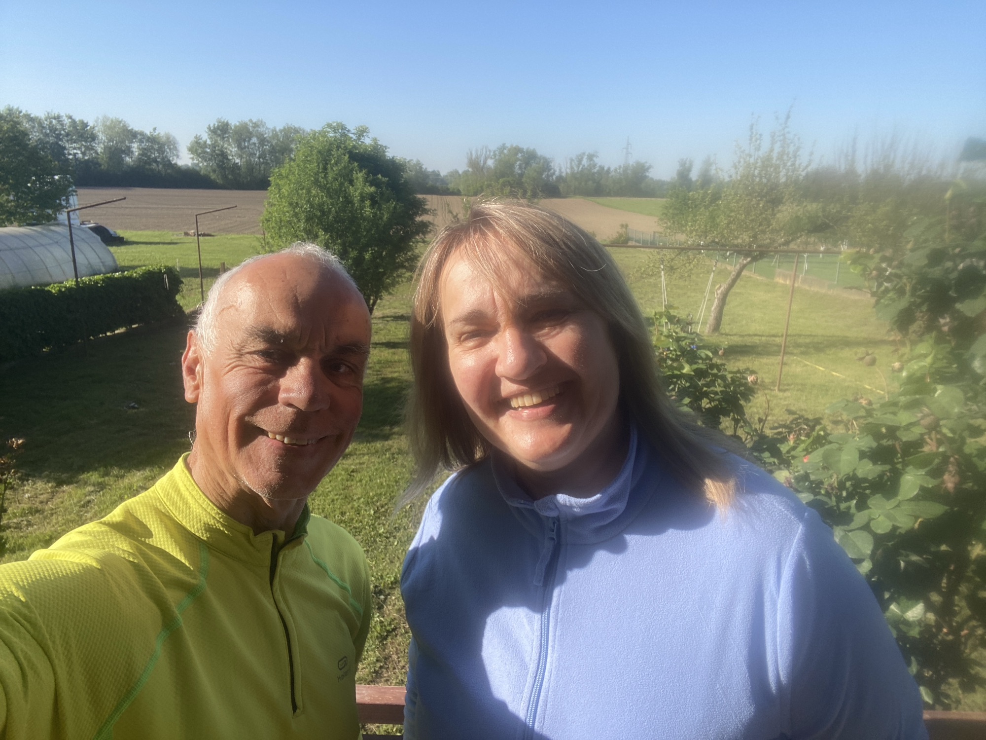 Le remplissage de mes bidons dans la cuisine donne à Nives l’occasion de garnir encore un peu plus mes sacoches avec une pomme et du chocolat. Et puis elle verse avec mon accord deux cuillerées de potion magique, une poudre vitaminée à base d’orange dans l’un de mes bidons. Elle est médecin, je lui fait confiance sur la qualité du produit. On se quitte avec force effusions car ce fut vraiment un beau moment de partage.