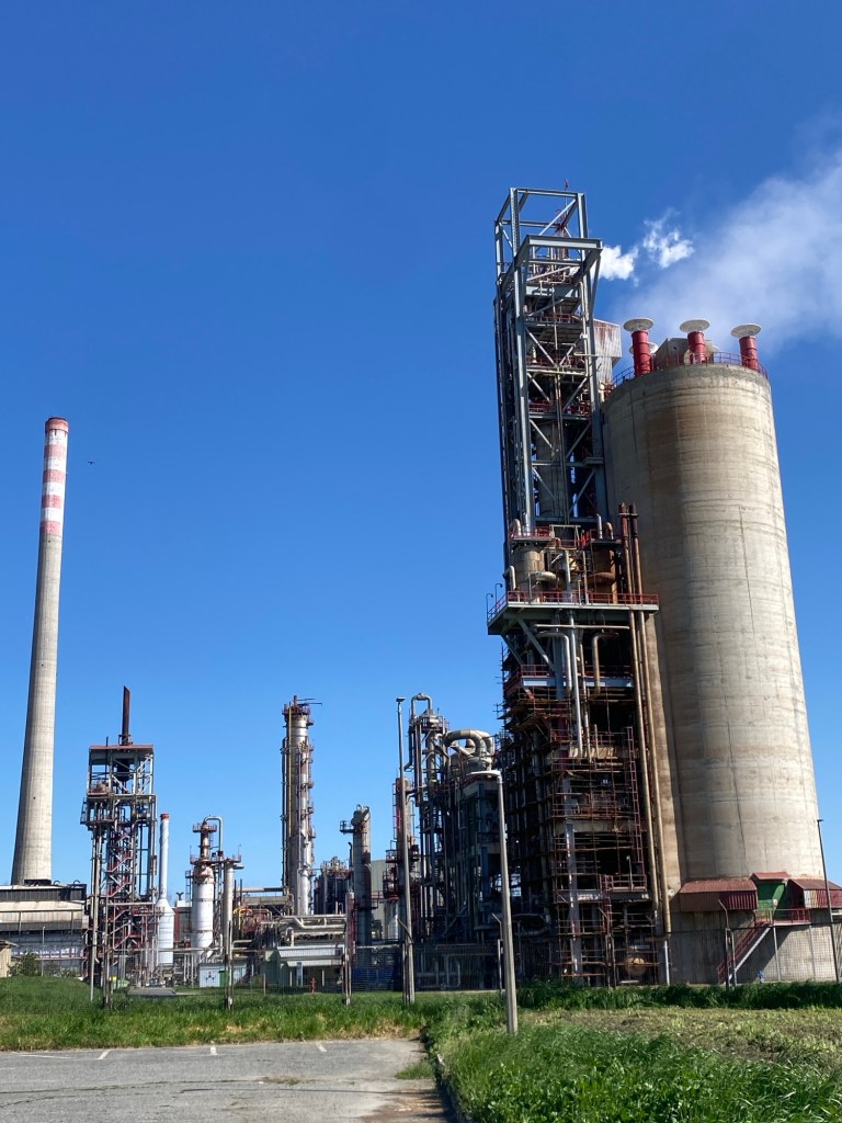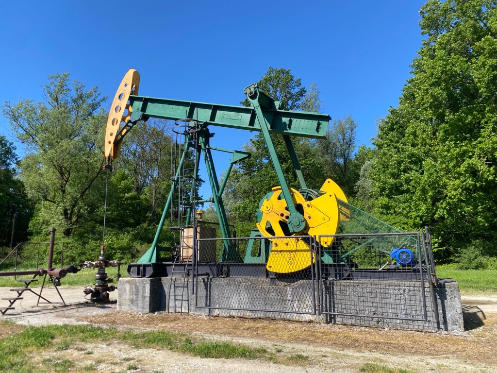 La première partie est agréable, sur des petites routes très calmes, surtout en ce dimanche matin. Avec le copieux petit déjeuner absorbé, je tiens facilement 60 Km avant de m’arrêter déjeuner dans le square de l’église de Popovaca. Vient ensuite la deuxième partie, beaucoup moins agréable, une route rectiligne en plein à contresens du vent et de plus bien fréquentée. Ce pensum d’une trentaine de kilomètres me semble très long. Seul le complexe pétrochimique de Kutina vient rompre la monotonie de ce parcours qui présente quand même une particularité singulière : il n’y a jamais vraiment de campagne ni jamais vraiment de villages, mais une succession de maisons alignées le long de la route sur plusieurs dizaines de kilomètres. Pas de routes adjacentes, pas de cœurs de bourgs, c’est un alignement sans fin de maisons. Voilà une curieuse organisation de l’espace qui m’interroge au moins sur deux points, la question des réseaux qu’il faut implanter sur ces longues distances et celle de la vie de village; comment animer un village qui n’a pas de centre et dont les habitations sont posées les unes à côté des autres en enfilade ? Étonnant.
