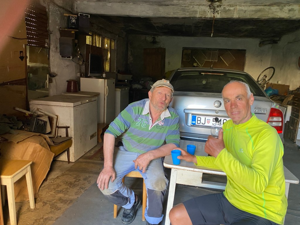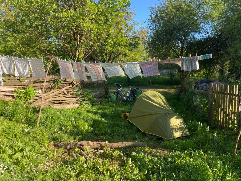 Comme je m’y attendais, mes sollicitations dans le centre-ville ne rencontrent pas d’écho favorable. A la sortie en revanche, je suis accepté par un type qui est devant son garage, à bricoler une tronçonneuse. Il ne parle pas d’autre langue que la sienne, mais il comprend ce que je souhaite et se lance dans de grandes explications dont je ne retiens que deux mots, police et migrants. Alors, c’est oui ou c’est non ? Da ? Allez, je m’installe à l’arrière de son jardin, où il m’accompagne en continuant de me parler sans cesse. Et comme je ne comprends pas, il parle très fort. C’est bien connu, on comprend mieux une langue étrangère avec les oreilles cassées. Le bonhomme est sympathique, mais plutôt rustique et je sais déjà que nos échanges n’auront rien à voir avec ceux d’hier soir et ce matin. Une fois la tente montée, je suis convié à boire un verre de thé glacé dans le garage/atelier en compagnie de son épouse et je suis condamné à écouter ses propos qui m’échappent totalement. Les moments les plus compliqués, c’est quand il me pose une question, il est là à attendre une réponse qui ne viendra jamais. Bref, je suis bien content de ne pas être invité à dîner ce soir.