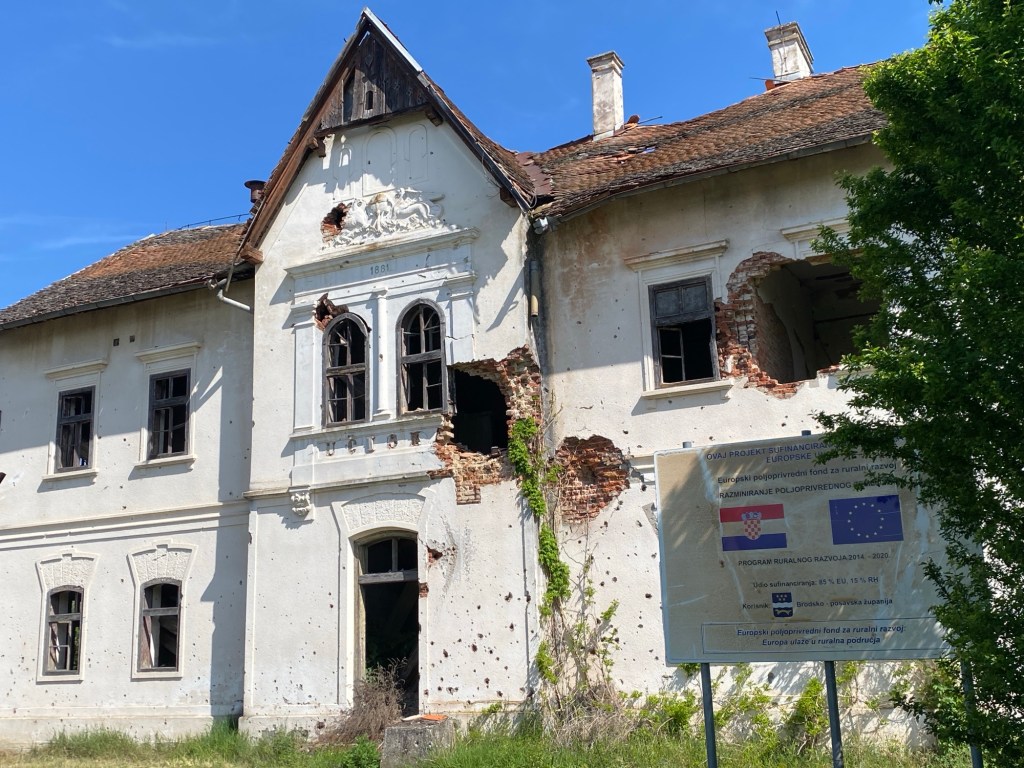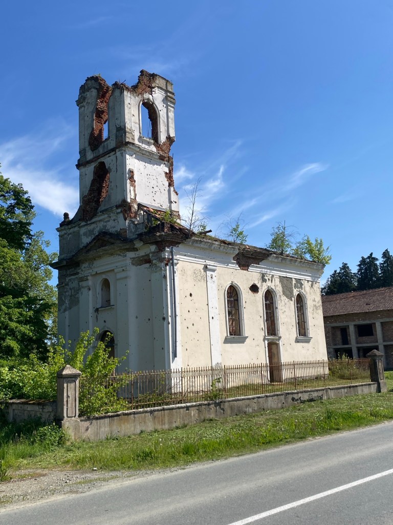 Ce qui me frappe aussi, c’est le nombre de maisons abandonnées, en ruine, ou à vendre, parfois les trois en même temps. Peut-être faut-il y voir là les traces de l’exil des populations serbes après la guerre de 1991-1995 durant laquelle cette partie du territoire croate avait été intégrée dans la république fantoche de Krajina. Du 1er au 3 mai 95, l’armée croate a mené une opération éclair, l’opération bjlesak, qui a obligé les Serbes à capituler et à renoncer à leur domination sur la Slavonie orientale, territoire finalement réintégré à la Croatie en 1998. À Okucani, un monument commémore la mémoire des soldats croates tombés lors de cette offensive et plusieurs façades de maisons et des bâtiments publics conservent les traces de ces combats.