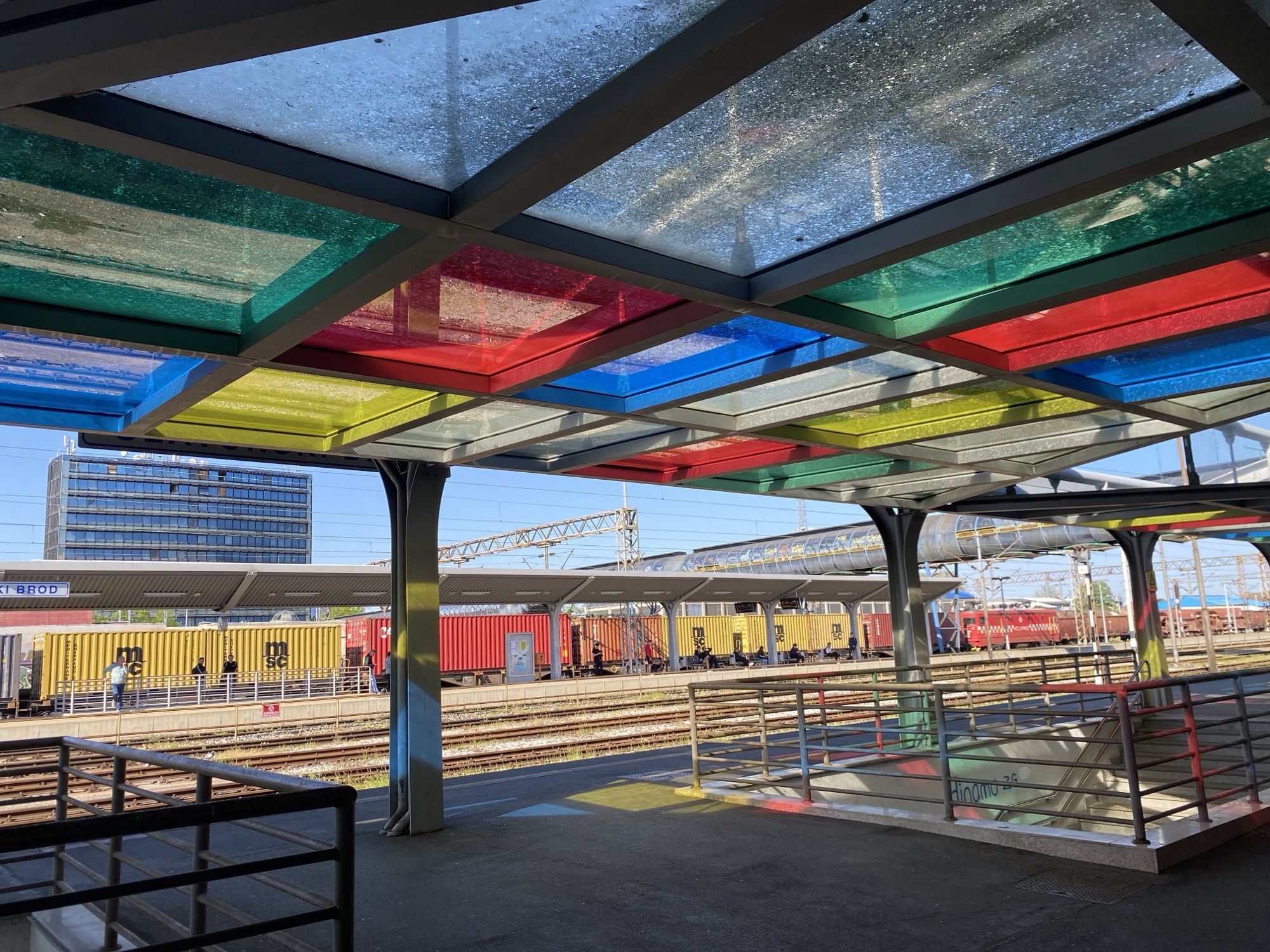 Malgré tout il est à peine 16h quand j’arrive à destination, alors je prends le temps de jeter un coup d’œil à la gare qui a vu passer le Simplon Orient Express. Elle ne parait pas très modernes, de l’herbe pousse sur les voies et elle serait quelconque sans les panneaux translucides colorés qui couvrent le auvent. En passant au travers, les rayons du soleil éclaboussent le quai de couleurs chatoyantes. Original.