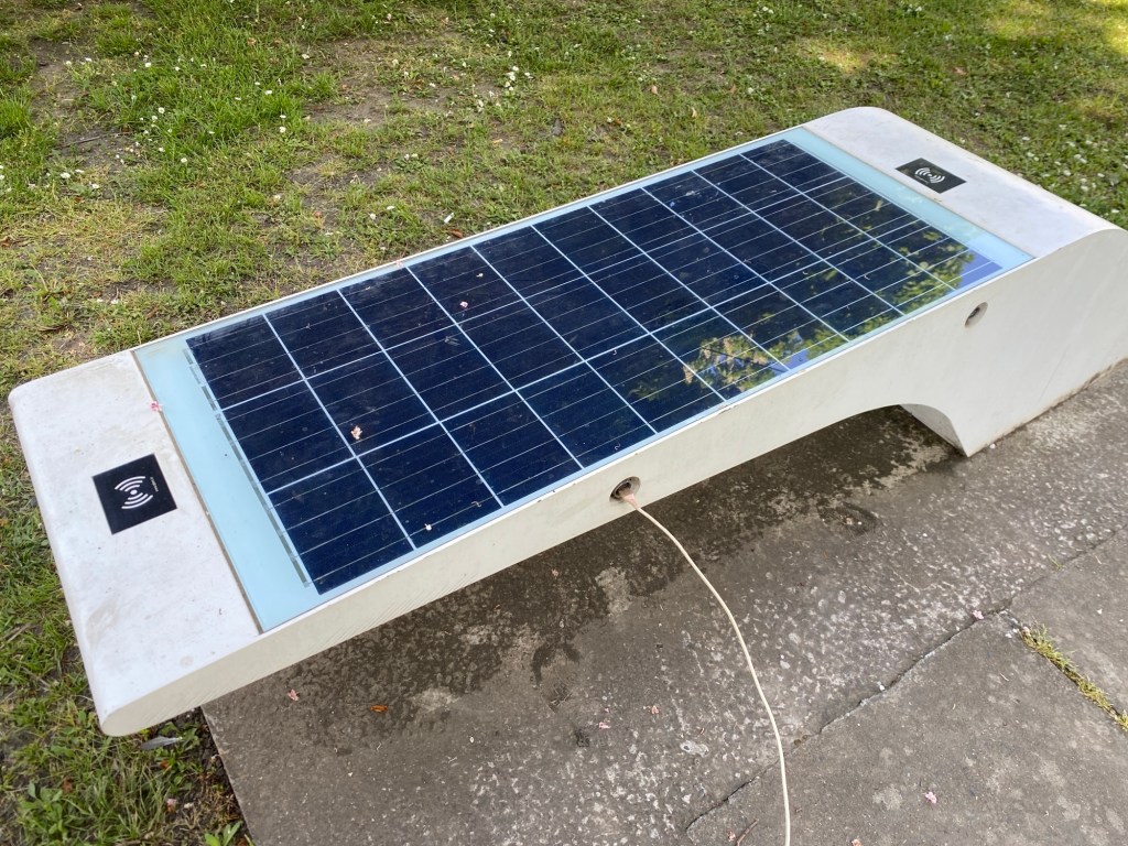 Vers 11h je grignote un en-cas dans le square du village de Stari Mikanovci, où je découvre un objet inconnu, un banc-chargeur solaire. J’y branche mon téléphone qui récupère quelques pour cents de charge bien que ledit banc soit actuellement à l’ombre.